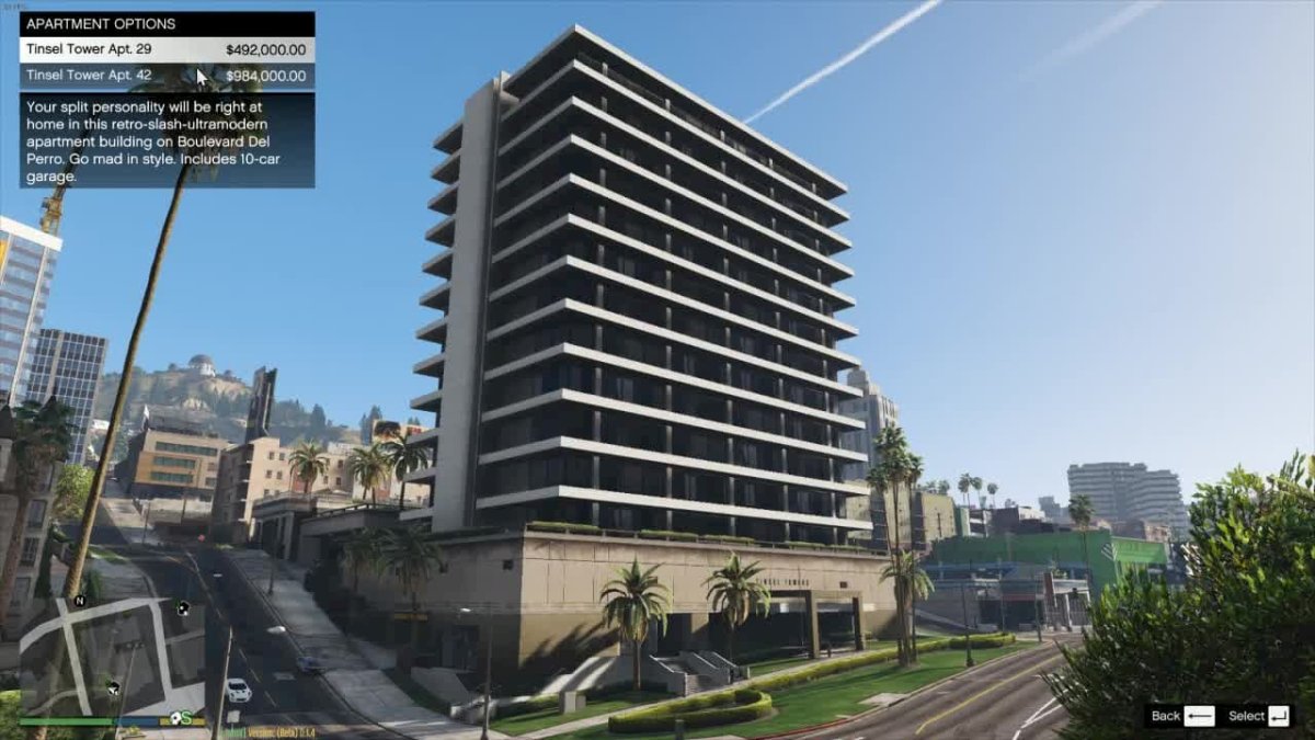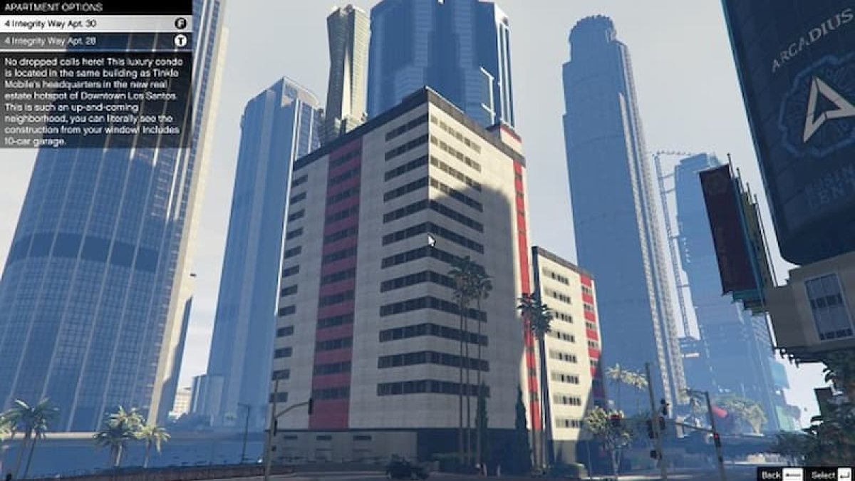 Situado en el Downtown de Los Santos, el número 4 de Integrity Way no es el edificio más bontito de la ciudad pero cuenta con apartamentos de lujo que incluyen en el precio un garaje en el que vas a poder guardar hasta 10 coches y 3 bicicletas. Los precios de los apartamentos van desde lso 235.000 dólares a los 476.000 doláres.